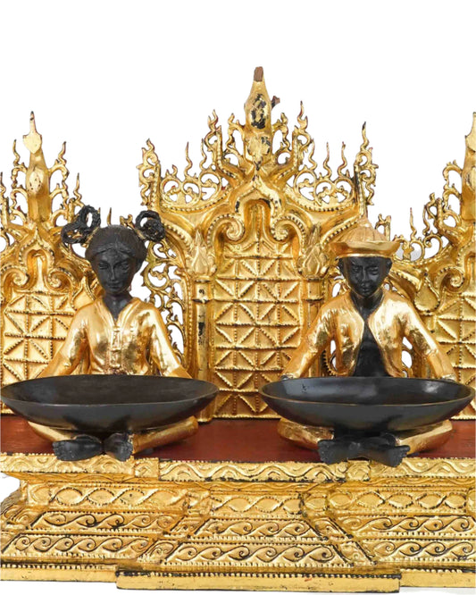 Fine Carved Burmese Wooden Altar With Two Bronze Figures Holding Trays