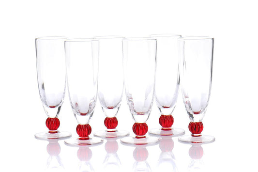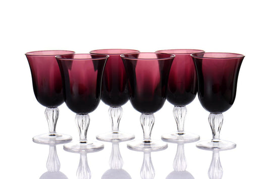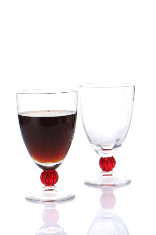 Murano Handblown Clear Goblet Glass with Red Accent Stem- Set of 6