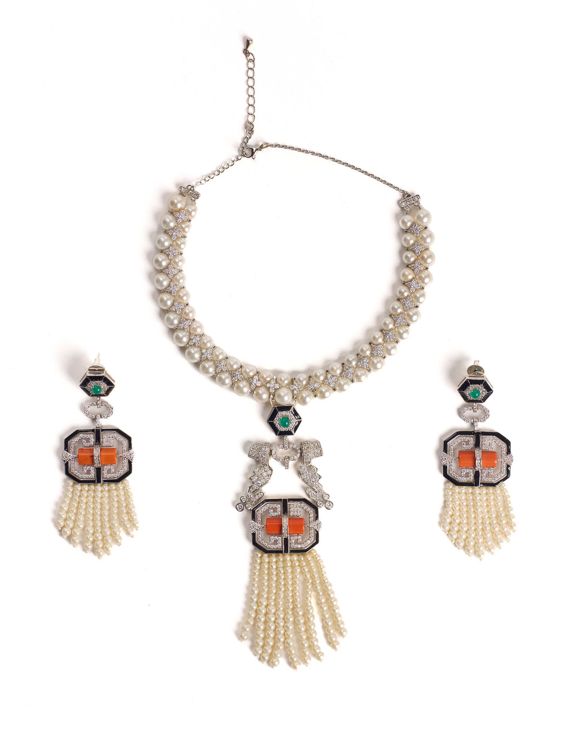 This is a pearl tassel necklace featuring a double strand of pearls at the top, an octagonal pendant with a green stone at the center connecting to a decorative, diamond-studded element. A larger, black and orange octagonal section with a geometric design, also adorned with diamonds and a tassel of hanging pearls at the bottom.